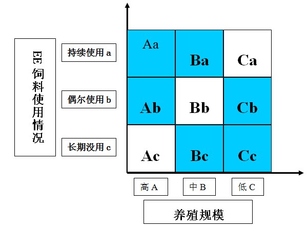 对顾客进行分等的目的是寻找并争夺重要顾客。养殖规模考查的指标为现存栏总数。依据养殖规模,将养殖户分为A、B、C三类,其中各类养殖户养殖总规模分占目标村总规模的1/3左右。预计各类养殖户数分别占目标村养殖总户数的10%、30%、60%。同时,依据使用EE饲料的情况将养殖户分成a、b、c三级。持续使用EE饲料的忠诚客户,为a级;偶尔使用,即一年内使用过EE饲料的,为b级;长期没用,即一年没有使用EE饲料的,为c级。依据以上两个指标,将目标村全部养殖户分为三等: