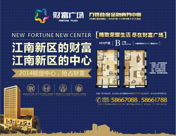 在第一轮强销阶段,配合MINI户型产品的推出,深度挖掘产品特性,推出“不要装、不可能、不相信、不要等、不要心”系列“财富广场向您说不”广告,打破常规,牢牢抓住消费者眼球,开展“逆向思维”广告宣传攻势,在前期媒体宣传的基础上,增加“开盘活动(事件营销)、DM单面派发、社区海报张贴”等动作营销,把视觉与行动紧密联合起来,把宣传势头推向一波高潮。