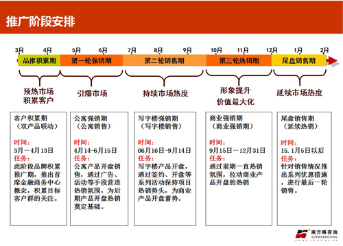南方略根据项目的进度及全年营销节点特征,结合全年推广费用的预算安排,因地制宜选择适合的推广载体及手段,安排财富广场的推广阶段及计划!