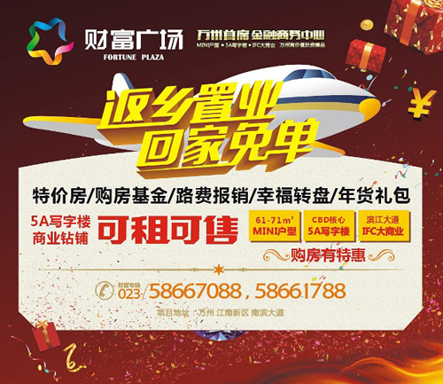 重庆万州财富广场项目为一个小型综合体项目,开发商为重庆绿筑置业发展有限公司。项目位于江南新区中央商务CBD区域,体量约11.3万方,涵盖了MINI户型、5A写字楼和IFC大商业项目,将打造成为江南新区首席金融商业综合体。