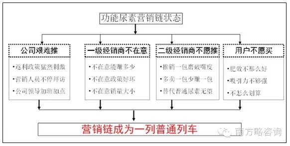 鲁西氮肥情况,2008年在全国率先走差异化,开发出多肽尿素、缓释尿素等新品种,到2012年销量持续增长。然而由于惯性因素,在进入竞争激烈和渠道混乱的状态下,销量开始出现波动,2013年不增、2014年预跌。氮肥销售公司处在“产品良莠不齐、经销商不愿推、零售商倒挂卖、厂家亏损大”的不健康尿素生态系统中拼搏。