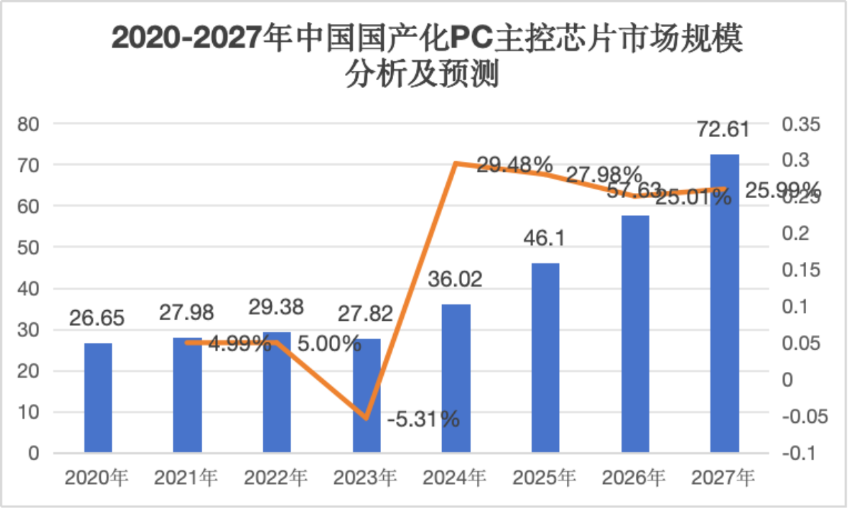 2020至2024年间,中国国产化PC主控芯片市场规模经历波动但总体向上,从26.65亿元增长至36.02亿元。2022-2023年受全球芯片供应链波动影响短暂回调,但2024年随信创政策深化实现29.4%的同比反弹。据行业预测,2025年市场规模将突破46.1亿元,2027年达72.61亿元,年复合增长率达15.2%,显著高于全球主控芯片2.92%的平均增速。