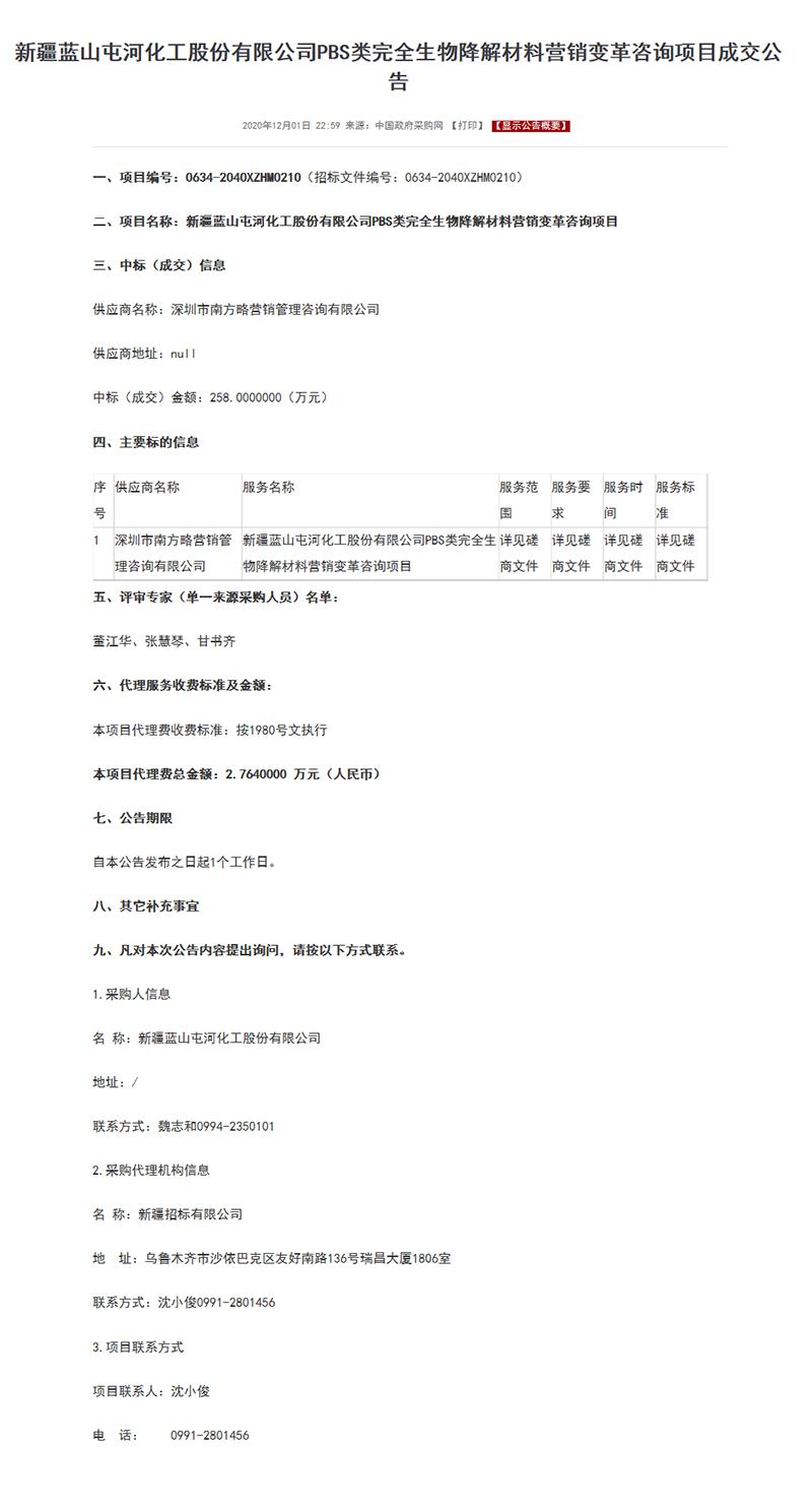 中标!南方略营销管理咨询集团中标新疆蓝山屯河化工股份有限公司PBS类完全生物降解材料营销变革咨询项目,中标金额:258万元!