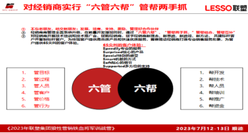 三是渠道经销商的管理与赋能体系,联塑集团在全国有3000多个一级经销商,是管道行业分销之王,渠道非常庞大,388vip太阳集团公司总结了一套经销商“六帮六管”的体系,刘祖轲老师说:“对经销商的管理就是最好的服务”,一下子颠覆了大家的观念,马上找到感觉和方法。