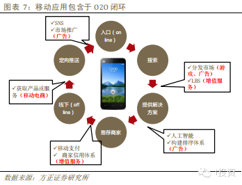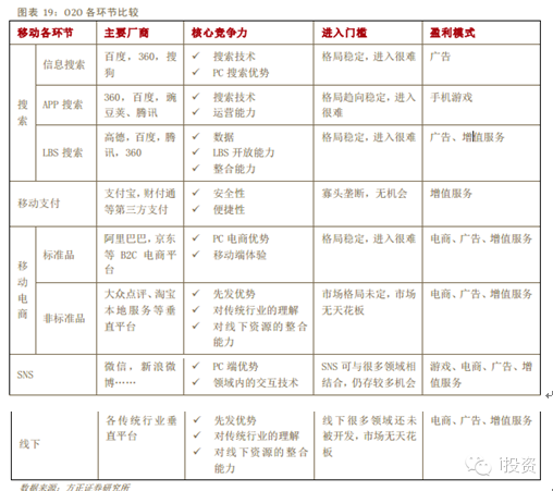 O2O闭环主要涉及环节包含线上入口、移动搜索、LBS、移动支付、线下商户、社交。我们通过对每个环节进行逐一分析,找到移动互联网相比于PC互联网的增量市场,进而挖掘投资标的。