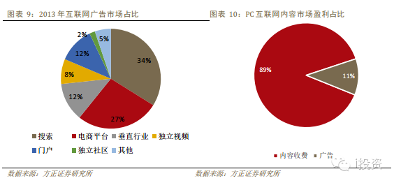 后端收费主要是广告模式,这种收费能力基于强大的流量导入能力以及具备广告合适的展示方式,目前主要应用在信息门户、在线视频领域。在线音乐和在线教育目前尚未找到盈利模式。我们认为移动互联网时代,受制于移动化、碎片化以及移动终端屏幕偏小的特征,广告效果会大幅减弱,盈利能力随之大幅降低,未来互联网内容盈利模式将以 直接面向用户前端收费能力的网络游戏、在线直播秀场、在线教育等作为主要研究方向。