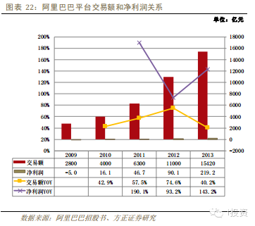 我们认为O2O生态体系内各环节建设类似阿里巴巴电商平台,但包含更多元素,更为复杂。通过下图阿里巴巴平台交易额和净利润的增长关系可以看到,互联网平台业绩爆发的前提是生态内的商户赚到钱,这样才有可能在生态内投入更多的推广费和增值服务费。但是我们观察O2O体系内的线下商户盈利情况发现,目前传统行业以及垂直平台还未从O2O大幅盈利,所以我们认为2014年纯线上互联网公司无法享受O2O红利,移动互联网O2O业务还无法对其贡献业绩。