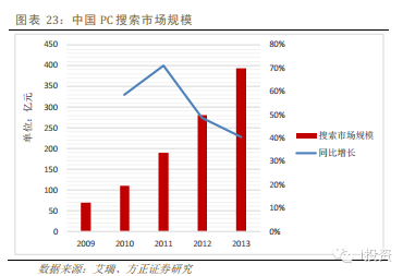 PC互联网的搜索形态主要是以信息搜索为主,市场格局百度一家独大,2013年搜索市场规模达到394.5亿。