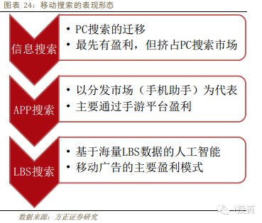 我们认为移动搜索的市场规模不会低于PC搜索,但是其表现形态更为复杂,主要表现为三类:信息搜索、APP搜索、基于LBS的精准推荐,其中最大的市场是基于LBS的精准推荐。