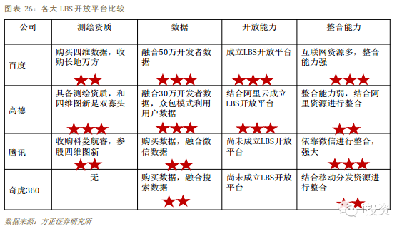 1)上游:具备测绘资质的基础地理信息采集商资源非常稀缺,阿里巴巴通过收购高德软件,腾讯通过参股四维图新的方式占据了LBS产业链的上游。