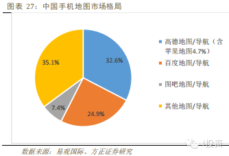 2)中游:导航软件厂商分布较为分散,且未来导航软件可被整合进入手机地图,具有被颠覆的风险。手机地图目前市场较为集中,由于手机地图直接面向用户,在马太效应下,未来会强者恒强,市场的集中度会进一步加大。目前手机地图市场上,百度和高德处于领先位置。