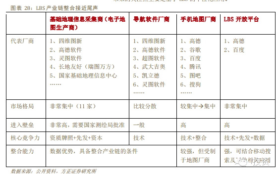 LBS作为移动互联网第一个明确的增量市场,最先迎来整合浪潮。LBS产业链中,两端的价值最高。