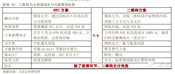 目前市场最大的争议点在于以二维码为主的互联网方案和以NFC为主的芯片方案谁将胜出。我们认为以二维码为主的互联网方案将最终胜出,但过程曲折。我们分别从解决方案、所需条件、方案成本、安全性、可替代性、推动力量、政策支持这7个重要方面进行比较。