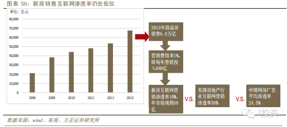 新房销售:新房2013年中国商品房销售额为6.8亿元,房地产开发商目前的营销费用率约为1%,即每年开发商的营销投入为680亿元,根据搜房、乐居等公司财报显示,2013年互联网营销渗透率为10%,市场规模为68亿元,相比于美国房地产互联网营销渗透率(56%)和中国网络广告渗透率(24.5%)均有较大提升空间,未来市场规模超百亿是大概率事件。