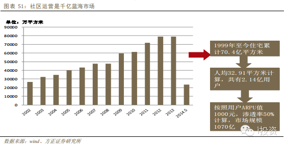 社区运营:中国经历了房地产发展的黄金十年,已经积累了海量的存量住户,但是房地产现有的商业模式并未将这些存量住户的价值开发,用互联网思维对传统物业进行改造,可以爆发一个千亿级的新市场。从2000年至2014年,新增商品房住宅累计达到70.4亿平方米,若按照人均32.91平方米计算,共有2.14亿用户。由于基于社区的服务项目包括物业、水电煤以及多项日常生活开支,所以按照单个用户贡献1000元/年,渗透率50%计算,年市场规模达到1070亿元。