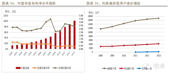 我们认为,目前金融市场最大的用户痛点就是收益率和风险无法完全匹配,也是互联网金融可以去颠覆的方向。从下图可以看到,2013中国存款总额达到100.9万亿,同比增加14.3%,但活期利率和一年期利率都出现下降趋势,同时风险偏好型用户逐步增加,但并无法获取对应的高收益率。我们认为,目前中国互联网金融市场的潜在空间巨大,但发展需要耐心。
