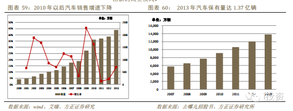 从下图可以看到,2010年以后全国汽车销量增长有明显下降,2011年-2013年的增长率分别为2.5%、4.3%和13.9%,汽车销售的瓶颈已经显现,而汽车销售互联网化可以帮助车厂和经销商提升汽车销售的效率,解决用户在购买汽车过程中的多项用户痛点,所以当前汽车互联网化的O2O模式发展主要集中在此环节。