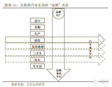 互联网汽车生态链中可被互联网化的有两大方向。汽车垂直平台和品牌垂直平台两类,两者形成“纵横”的关系网。