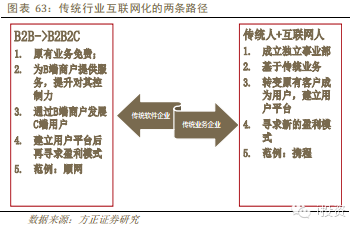 在传统行业互联网化的大趋势下,我们认为无论是传统企业互联网转型还是垂直互联网企业线下化发展,最终的目的都是为了获取属于自己的用户,建立用户平台后再将其变现。特别是针对传统企业互联网化转型,可以借鉴以下两条路径。