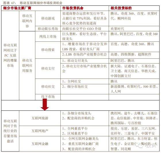 移动互联网相比于PC互联网的增量市场分为移动互联网内容和移动互联网应用服务两部分。移动互联网内容的增量市场主要在于移动游戏,移动互联网应用服务的增量市场主要在于O2O闭环各环节。