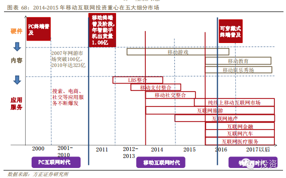移动互联网的发展的各环节有一定的时间顺序,从下图的时间轴可以看到,2014-2015年依次发展的细分市场有: