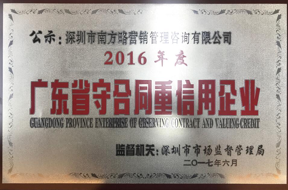 热烈祝贺南方略被评选为2016年度广东省守合同重信用企业!